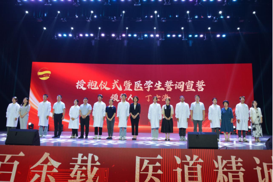 医学部副部长李冰,基础医学院党委副书记章敏,药学院常务副院长孙勇,护理学院党委副书记宋畅,第一临床医学院党委副书记邢晓明,YABO鸭脖附属青岛市中心医院副院长仇佩洁,YABO鸭脖附属妇女儿童医院总药师、药学部主任闫美兴,YABO鸭脖附属青岛市第三人民医院副院长袁涛,青岛市第六人民医院副院长高志棣上台为学生代表授予白袍,为他们的医学人生扣上第一粒扣子。全体学生穿上白袍,将梦想穿在身上,将责任铭记心中,将理想与信念根植在前进的道路。