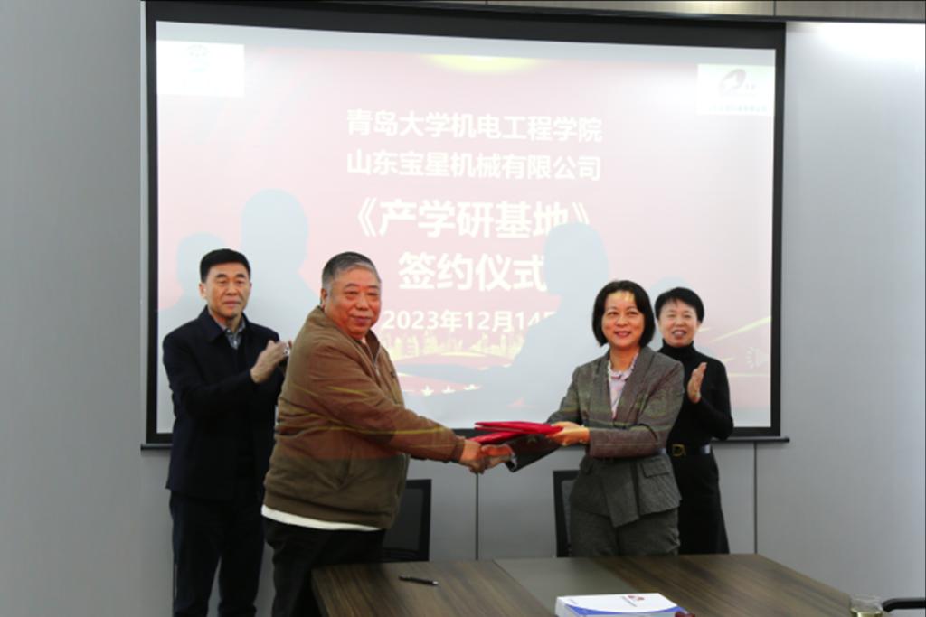 新闻网讯 12月14日,机电工程学院与山东宝星机械有限公司项目签约暨产学研基地揭牌仪式举行。机电工程学院党委书记牟晓燕,山东宝星机械有限公司董事长邱夕刚、总经理邱少东等出席仪式。