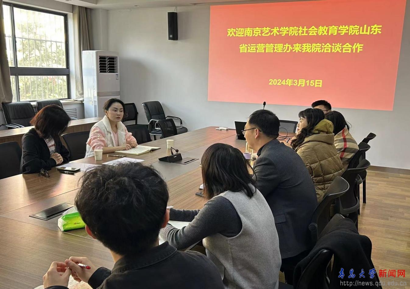 新闻网讯 3月15日,南京艺术学院社会教育学院山东省运营管理办主任王晨瑜一行三人来访音乐学院洽谈合作,院党委副书记孙建华、副院长董博超、学工办主任迟晓波、学生党支部书记朴博文等参加座谈交流。
