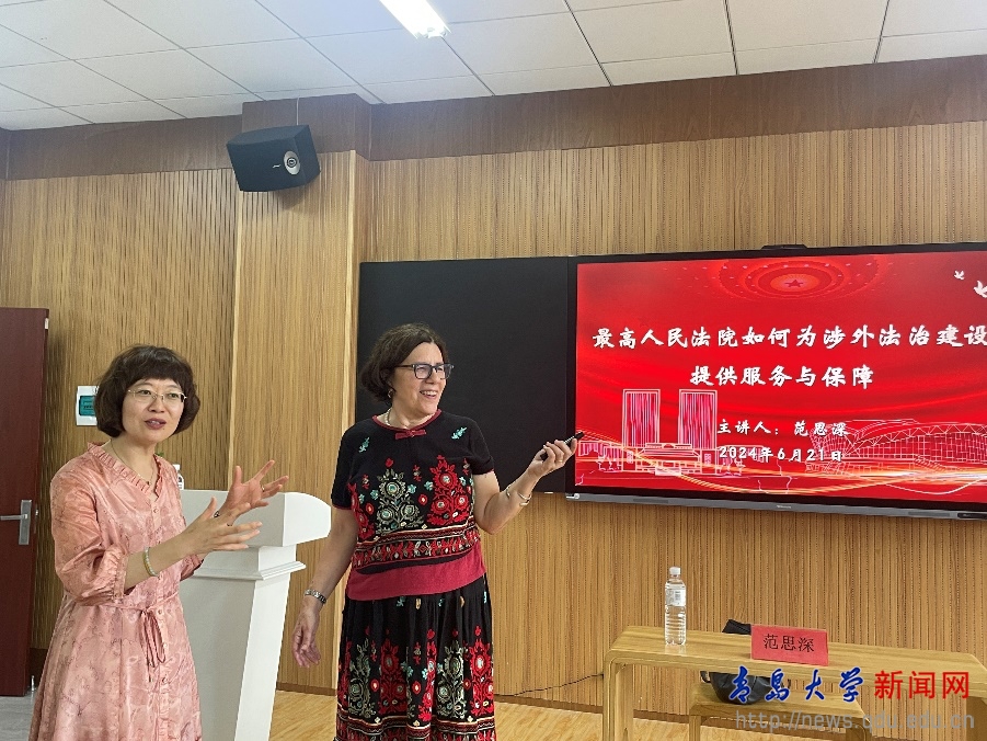 新闻网讯 6月21日,北京大学国际法学院常驻知名学者范思深教授(Susan Finder)应鸭脖邀请参加法学院组织的“法学家茶座活动”,为学校师生作了题为“最高人民法院如何为涉外法治建设提供服务与保障”的专题讲座。法学院副院长王静主持讲座,院长助理许庆永副教授、青年博士陈喆老师以及法学院、浮山书院的同学参加了此次讲座。