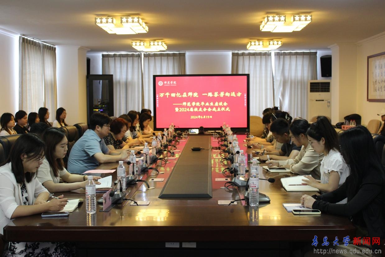 新闻网讯 6月19日上午,师范学院在德润楼301会议室举行毕业生座谈会暨校友会2024 届分会成立仪式。院党委副书记夏锡梅、副院长刘启民、院长助理王忠厚、学科办教学办负责人、全体学工老师出席活动,学工办主任姜彬主持。