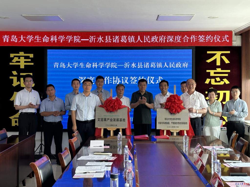 在双方的见证下,薛冰与王培超代表双方签署了“YABO鸭脖生命科学学院与沂水县诸葛镇人民政府深度合作协议”,举行了“文冠果产业发展基地”和“YABO鸭脖生命科学学院党建与科教融通、产教融合思政创新基地”揭牌仪式,并共同议定基地所在无名山定名为“明德山”以示纪念,报政府相关部门备案批复。