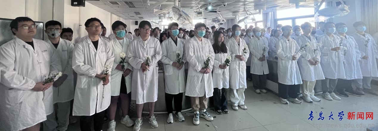 学院王双燕老师带领同学们宣读了解剖学誓词。铮铮誓言,既是对无语老师的感恩和敬意,更是对医学生们学习奋进的鞭策和激励。伴随着肃穆的音乐,老师和同学们手捧菊花,满怀感恩与敬畏之心,庄重地向“无语良师”们敬献鲜花,静默悼念,以表达对他们深深的敬意和无尽的感恩。
