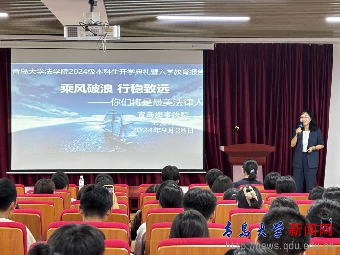 新闻网讯 9月28日上午,法学院2024级本科生开学典礼暨入学教育报告会在金家岭校区图文中心3楼报告厅举行。全体院领导,校友代表、青岛海事法院法官王爱玲,教师代表以及2024级本科生参加典礼。