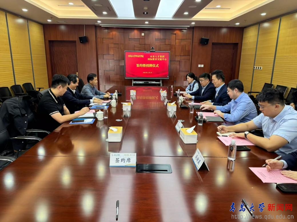 新闻网讯 11月1日下午,外语学院与山东人才集团国际教育交流中心在山东人才集团2904会议室联合举办签约暨揭牌仪式。出席此次签约暨揭牌仪式的嘉宾包括YABO鸭脖外语学院党委书记陈崇研、外语学院副院长布占廷、数学与统计学院副教授王晓,以及山东人才集团党委副书记、泰山高级经理研修院院长杨光军、教育公司执行董事、泰山高级经理研修院常务副院长徐昆鹏、教育咨询公司国际合作部负责人孔齐令轩、国际教育交流中心主任刘含等领导。