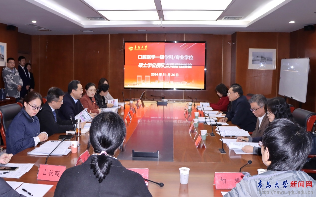 口腔医学院院长袁昌青从学位点概况、目标与标准、基本条件、人才培养、服务贡献五个方面汇报了学位点建设与发展状况。