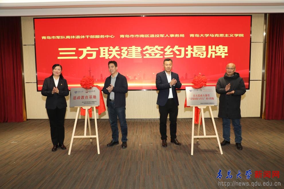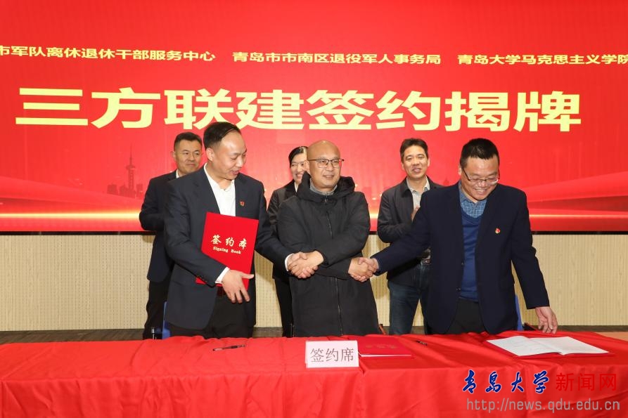 为深入学习习近平新时代中国特色社会主义思想,切实把习近平总书记关于“大思政课”及退役军人工作重要论述要求落到实处,充分发挥高校教育资源和退役军人事务部门红色资源优势,马克思主义学院(YABO鸭脖思政大课堂中心)分别在青岛市军队离休退休干部服务中心和青岛市市南区退役军人事务局建立“思政教育基地”和“‘青情向阳与军行’研习基地,用于学生社会实践和思政教育。在此基础上,为切实推动实现“互联共建、互助共赢”,三方本着自愿、平等、公平、诚信的原则,经友好协商,就以党建统领联建,在资源优化配置、提升服务效能等方面达成初步达成相关协议,以期推动退役军人事务工作与高校思政教育的深度融合,提升高校思政教育质量和水平,为退役军人提供更好服务。