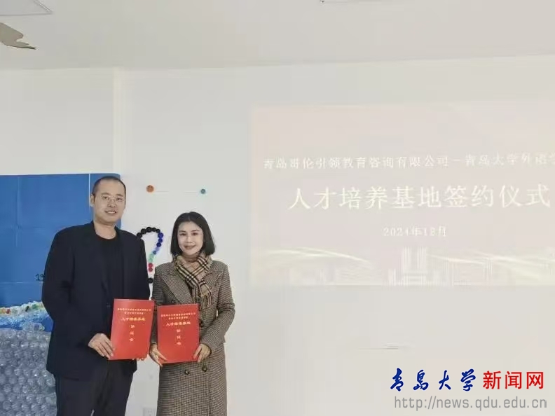 新闻网讯 为落实需求导向的育人理念,强化外语学院高质量就业,准确掌握企业用人需求,切实提升人才培养质量,12月13日外语学院和青岛哥伦引领教育咨询有限公司开展“人才培养基地”合约书签订暨校外就业导师聘任仪式。青岛哥伦引领教育咨询有限公司总经理张福亮一行、外语学院党委副书记于苗、英语系副主任王昕、学工办主任温凌鹤、团委副书记张淑敏及毕业生代表参会。