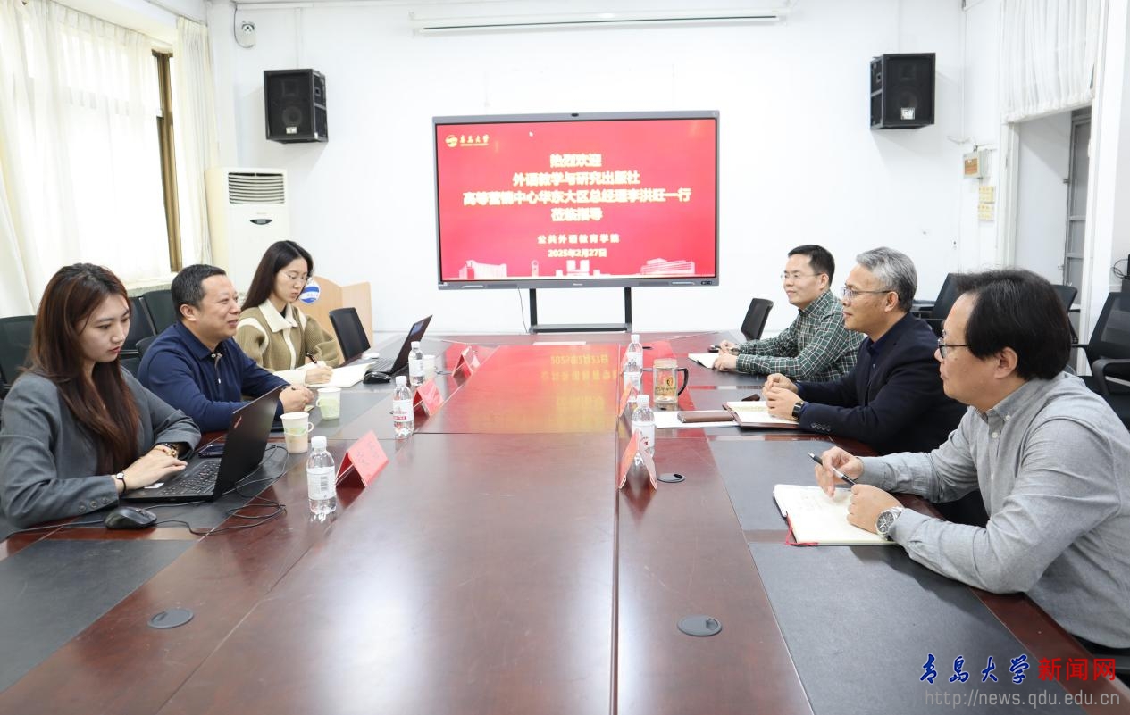 新闻网讯 近日,外语教学与研究出版社高等营销中心华东大区总经理李洪旺一行到访我院。公共外语教育学院院长国林祥、副院长陈安榕、佴云国等出席交流活动。国林祥主持交流会。