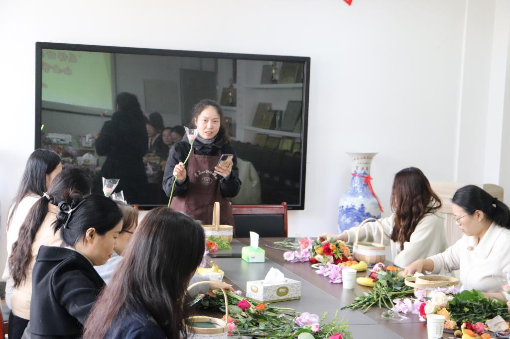 主题活动涵盖插花和献花两个环节,从花卉象征意义、色彩搭配到基本造型方法,女教师们学习花艺知识并修剪搭配,零散花枝变成精美作品,现场气氛热烈。