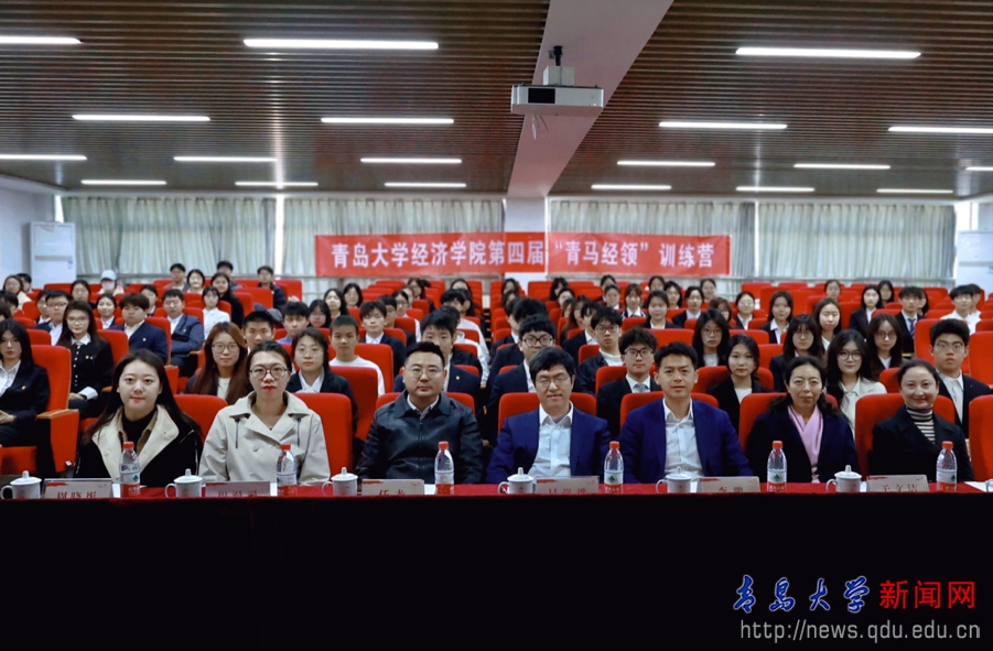 新闻网讯 为进一步提升学生干部理论自觉与自信,培养责任意识,提高工作技能和合作能力,打造心中有爱、肩上有责的学生干部团队,助力学生成长为中国特色社会主义坚定信仰者,近日,经济学院在图文中心3楼报告厅举办第四届“青马经领”训练营,围绕“书记谈”、“专家讲”、“朋辈说”、“营员悟”等主题展开培训。校团委书记李鹏,经济学院领导班子成员、辅导员代表及训练营全体学员出席。