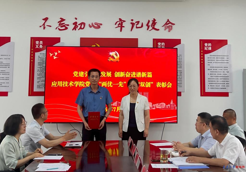 学院党委副书记、院长耿宝福宣读《中共YABO鸭脖应用技术学院委员会关于表彰优秀共产党员、优秀党务工作者、先进党支部的决定》,授予曲莉等10名同志“学院优秀共产党员”荣誉称号,授予刘梅等3名同志“学院优秀党务工作者”荣誉称号,授予教工第一党支部“学院先进党支部”;宣布刘伟同志获“校优秀共产党员”荣誉称号,教工第二党支部获评YABO鸭脖党建工作样板支部培育创建单位。学院领导分别为获奖个人与集体颁奖。