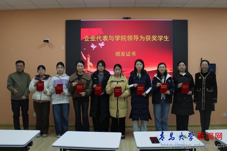 仪式上,于文洁代表学院向设立奖助学金的校友企业表示感谢,并对获奖学生提出殷切勉励。她表示,这份资助既是校友对母校深厚情谊的体现,也为在校学子树立了感恩与奉献的良好榜样。于文洁与秦先生共同为获奖学生颁发了荣誉证书并合影留念。
