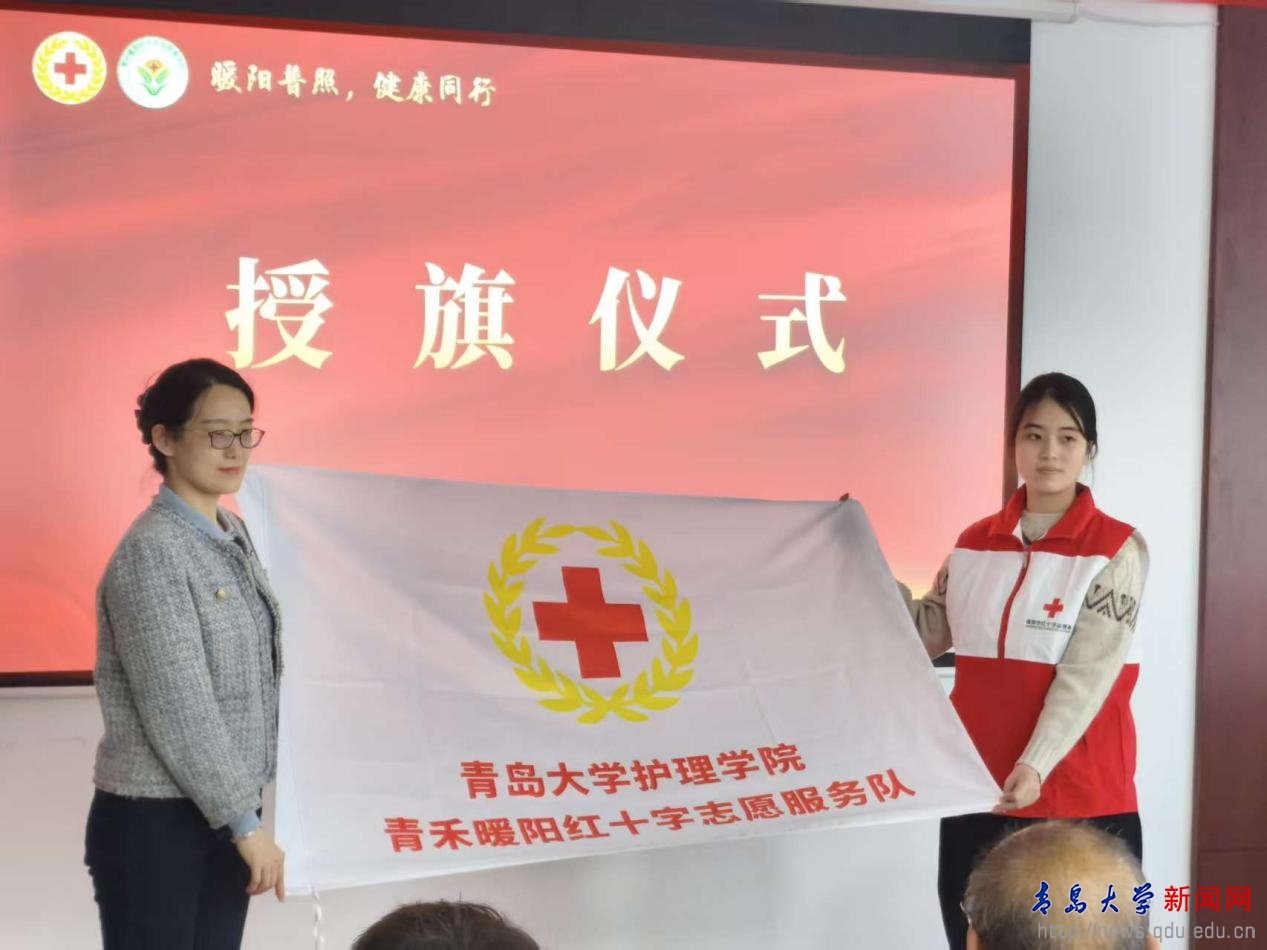 青岛市红十字会事业发展部部长薛梅手持队旗,郑重将队旗授予服务队。