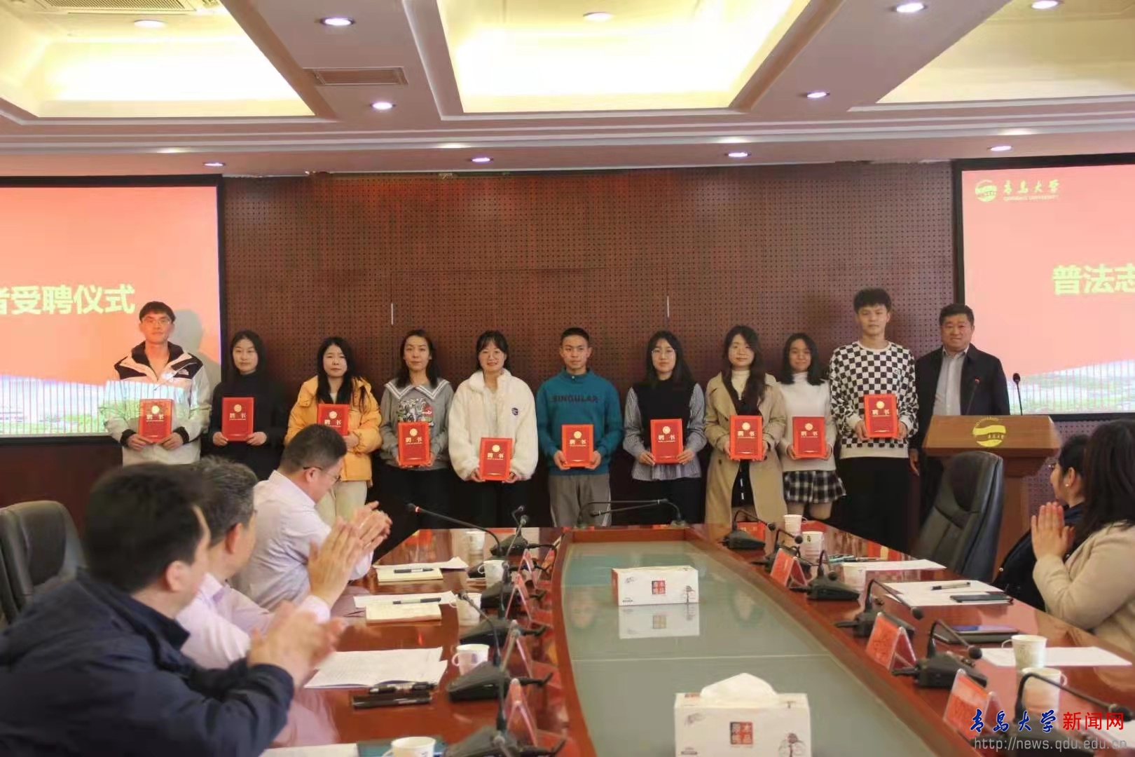 仪式上,相关职能部门负责人为鸭脖“大学生普法宣讲团”志愿者颁发聘书、为学生代表赠送了普法图书。