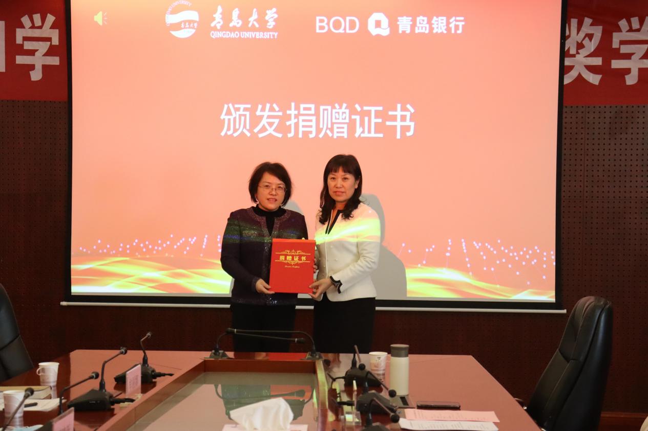 刘彩云代表鸭脖向青岛银行颁发捐赠证书,学生代表向青岛银行赠送了一本满载获奖学生谢意与梦想的感恩纪念册。