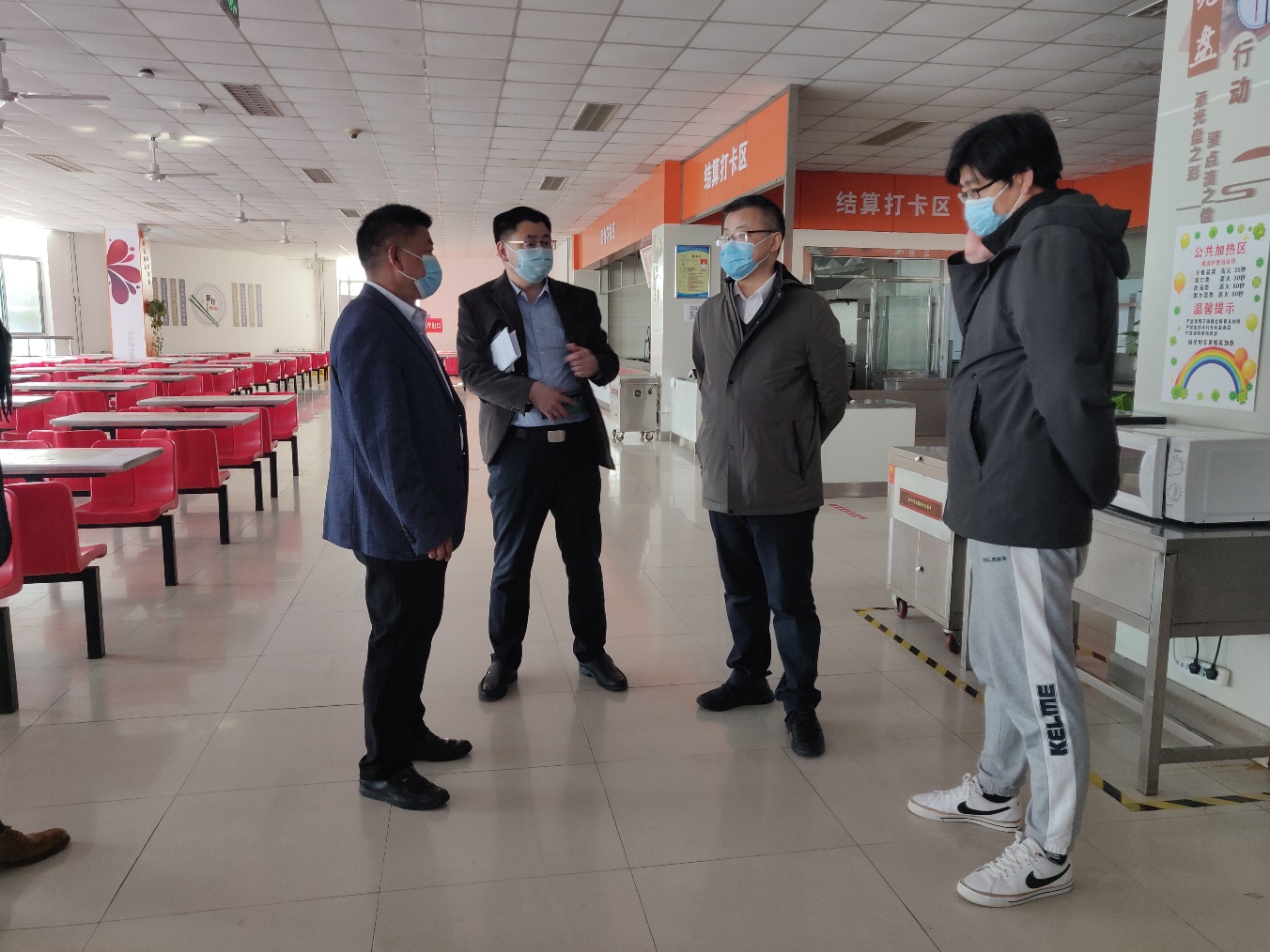 专班一行重点检查了校门、国际教育学院、继续教育学院、餐厅等场所,查看了疫情防控工作档案。肖江南问询调度了校门管理情况,对门卫岗位设置、不同时段人员管控提出了具体要求;详细询问了国际教育学院、继续教育学院合作办学的学生管理、疫情防控和教学安排,他强调既要做好疫情防控,又要关心关注这部分学生的学习和生活情况。在餐厅的现场检查中,肖江南对餐厅人员数量、日常监控管理、核酸检测安排、餐厅清洁消毒情况、食品卫生情况进行了全面督导。专班还现场查看了西院4号门管控及外围施工情况。