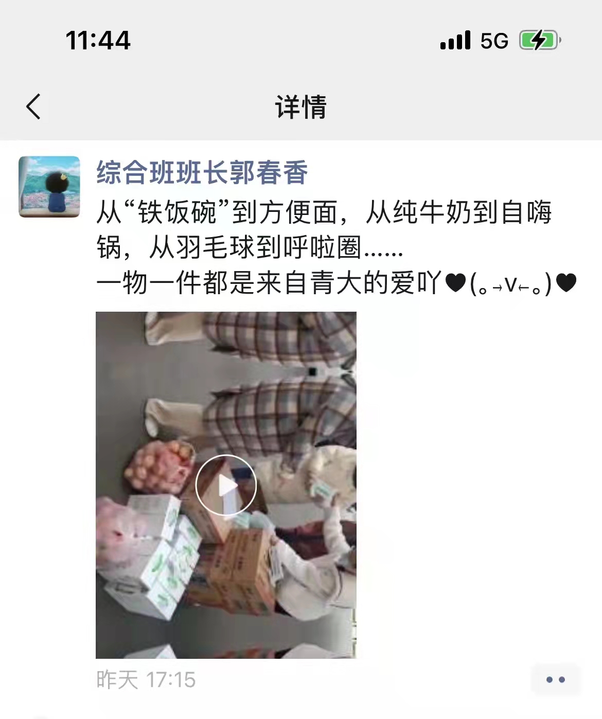 鸭脖正大光明眼科医院黄旭东院长表示,在严峻的疫情面前,人人都是保家卫国的“战士”,作为风雨同舟的兄弟单位,同学们的日常生活也处处牵动着我们的心,本次为同学们提供了自热火锅、牛奶、方便面、水果、口罩等生活必需品和抗疫物资,希望同学们在疫情期间做好个人防护,用强健的体魄和良好的精神面貌去迎接学习生活。