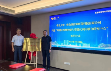 于永明副校长与李绍坤董事长为“联合研究中心”揭牌。鸭脖环境科学与工程学院陈光辉副教授与青岛绿洁坤环保科技有限公司李佳麟总经理签订《YABO鸭脖-青岛绿洁坤环保科技有限公司共建“环境污染物控制与资源化利用联合研究中心”合作协议》。