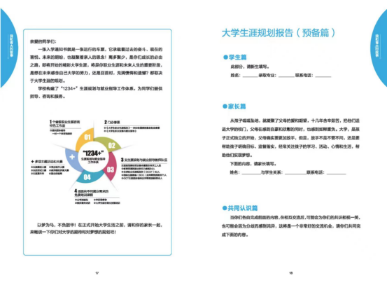 学生生涯发展中心按照“全程化”生涯育人理念,设计了《大学生涯规划报告》(预备篇),引导新生和家长一起思考大学生活,结合新生实际特点,制定科学的大学学业和生涯规划,辅导员会以此开展新生的学业规划和生涯启蒙教育工作,指导新生“规划自我,决胜未来”。此外,还精心制作了《生涯规划:在鸭脖成长的N种可能性》网络课程,呈现大学不同阶段的生涯风貌,传播生涯规划理念,指导生涯规划方法。