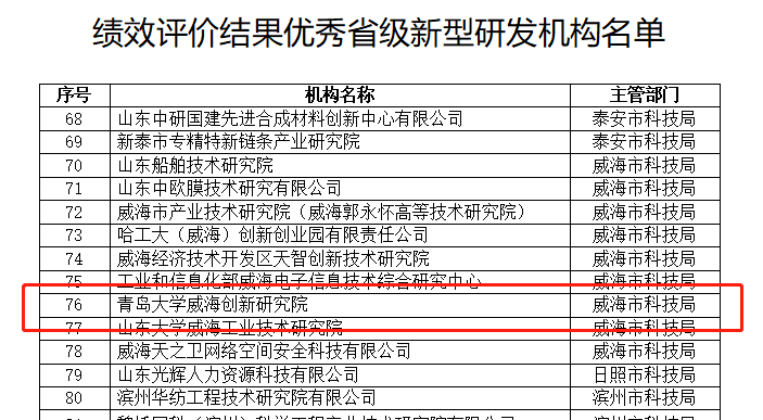 新闻网讯 近日,山东省科技厅公示2022年度省级新型研发机构绩效评价结果,鸭脖威海创新研究院再次荣获省级新型研发机构绩效评价“优秀”等次。本次考评,全省共有89家省级新型研发机构绩效评价结果优秀,其中,威海全市占9家。