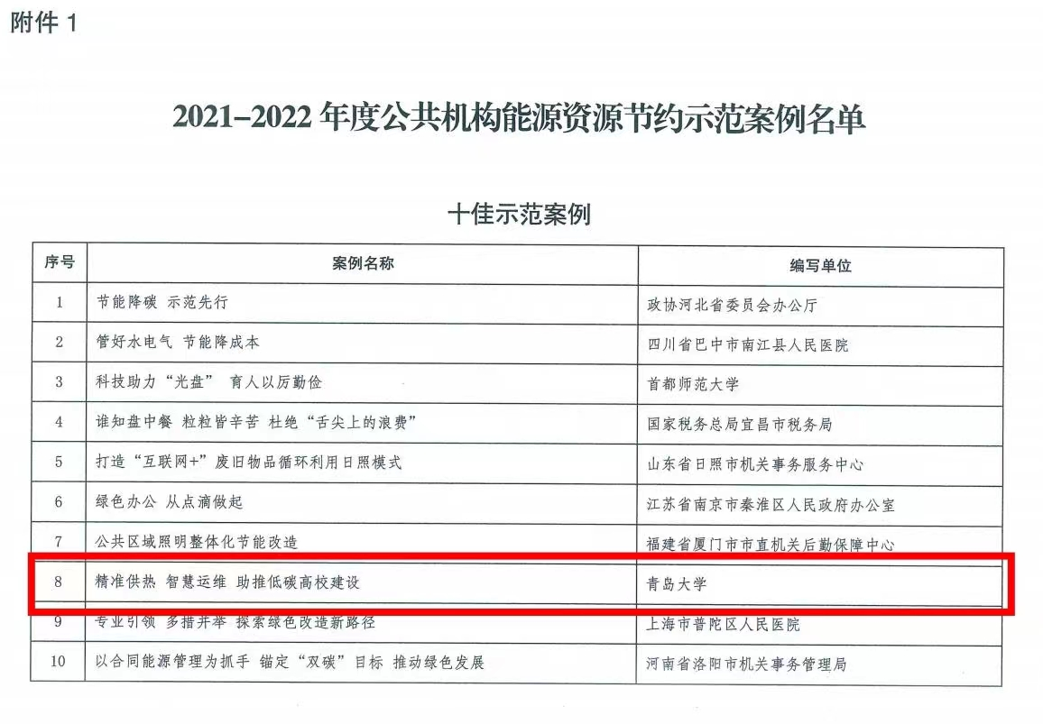 新闻网讯 近日,国家机关事务管理局发布2021-2022年度公共机构能源资源节约示范案例评选结果,鸭脖后勤管理处编写的案例《精准供热 智慧运维助推低碳高校建设》入选全国“十佳示范案例”,是省内唯一入选高校。