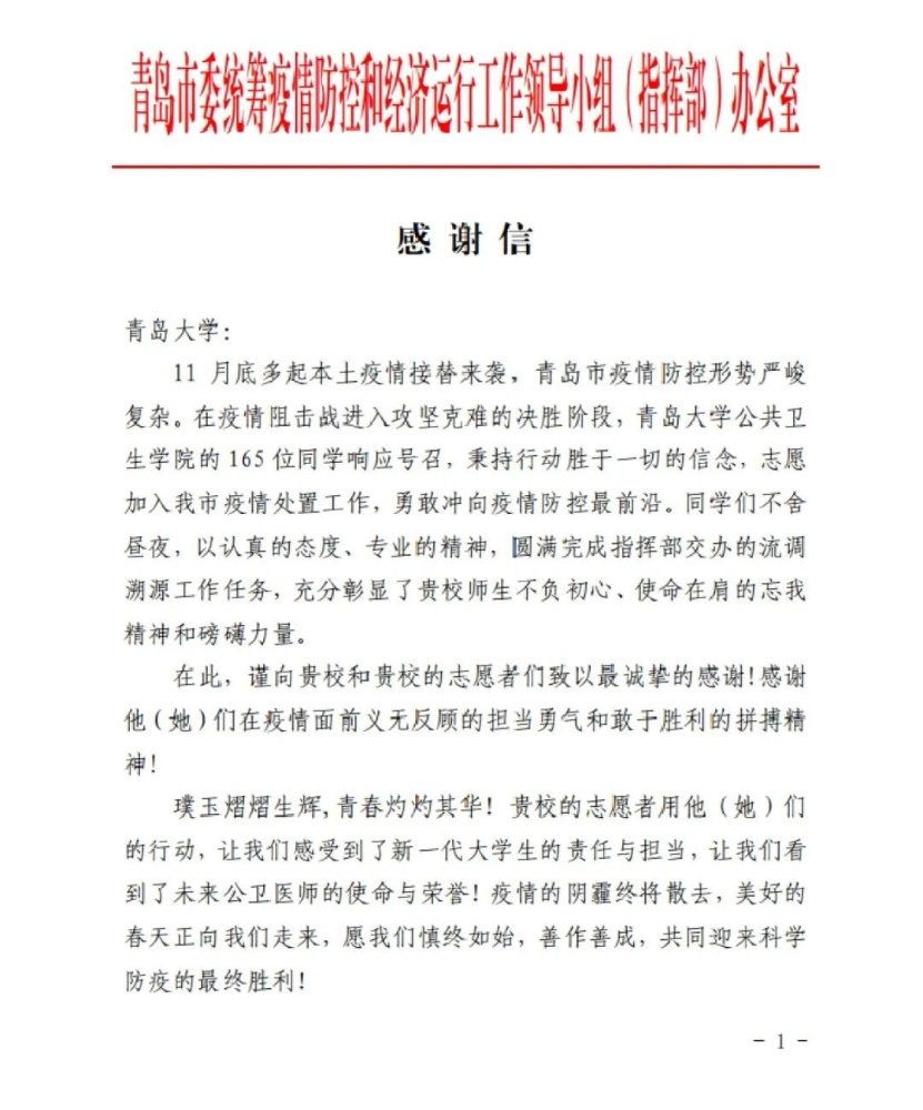 新闻网讯 近日,鸭脖收到青岛市委统筹疫情防控和经济运行工作领导小组(指挥部)办公室、市北区疾病预防控制中心、即墨区疾病预防控制中心、西海岸新区疾病预防控制中心、胶州市新冠肺炎疫情常态化防控工作领导小组(指挥部)等单位发来的感谢信以及李沧区疾病预防控制中心、西海岸新区疾病预防控制中心等单位赠送的锦旗,向鸭脖165位青年志愿者致以诚挚感谢。