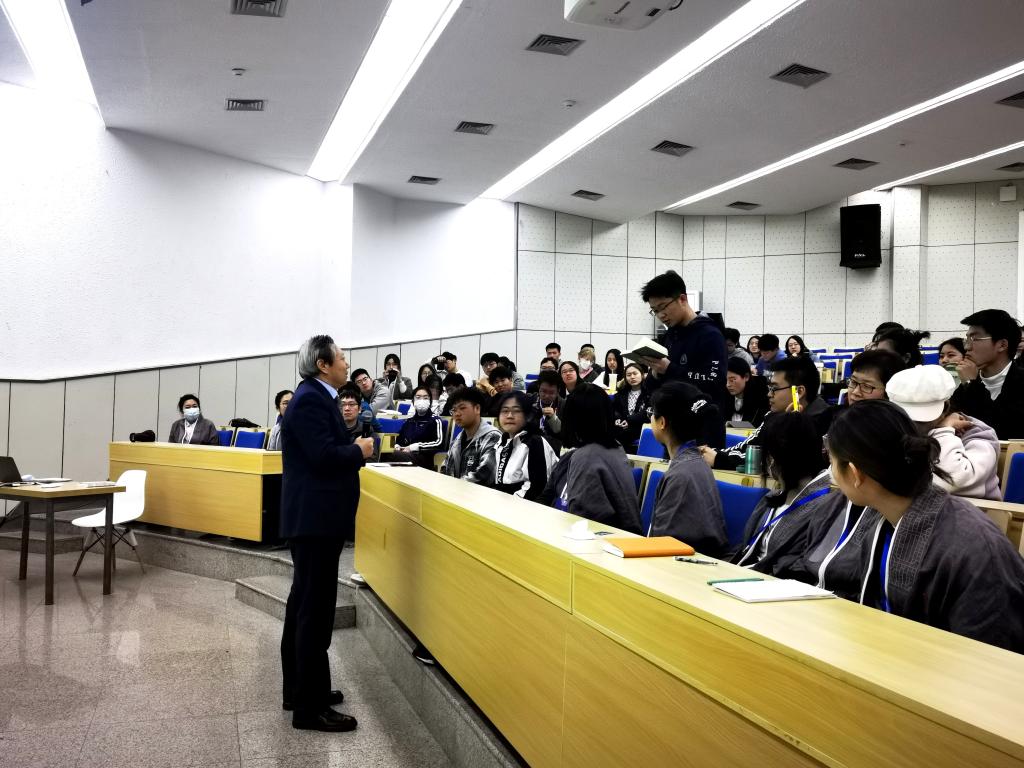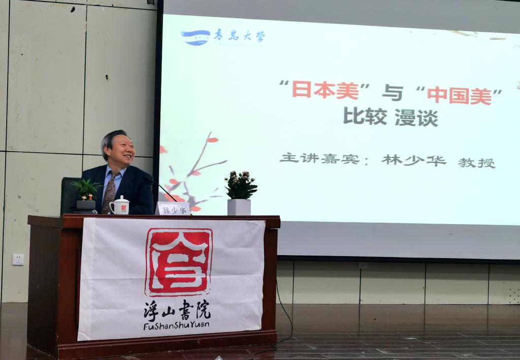 新闻网讯 4月9日晚,浮山讲堂第90期在浮山校区图书馆报告厅举行。著名翻译家、教授林少华应邀为鸭脖师生作了题为“樱花之美与梅花之美——‘日本美’与‘中国美’比较漫谈”的讲座。