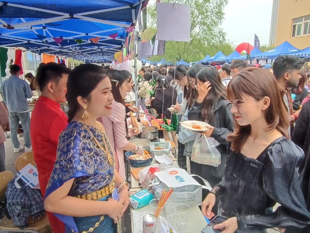 除节目展演之外,各国留学生还设置了不同的文化展示摊位,亲自动手制作独具本国色传统的美食,分享各自国家的文化。来自外语学院和纺织服装学院的同学们也带来了各自的多国文化展示作品和非遗作品,活动现场人流如织,热闹非凡。