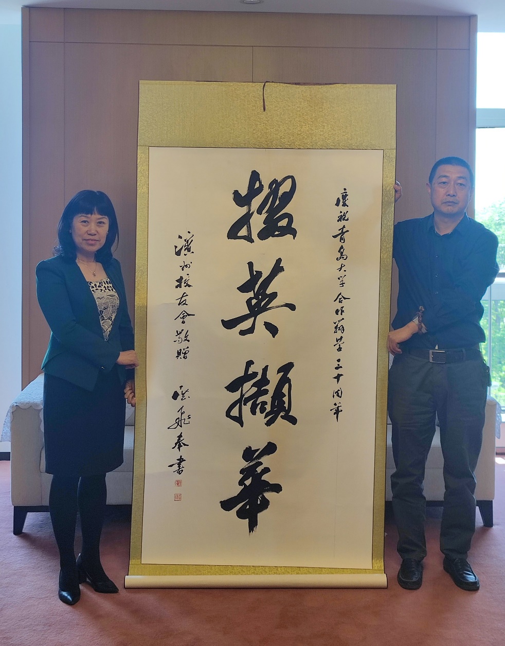 王世民会长向母校作了深情汇报。滨州校友会自成立以来,校领导多次莅临滨州校友会视察交流,给予校友会殷切关怀和指导。校友会积极组织校友开展活动,凝心聚情,成为滨州鸭脖校友移动的家园。值母校合并办学30周年,滨州校友会特邀中书协会员、中央国家机关书协常务理事、中国粮食书协常务副主席兼秘书长、著名书法家展飞先生题写巨幅书法礼品《掇英撷华》。“掇(duo)英撷(xie)华”四字,语出清黄宗羲《明文案序上》,寓意多层:既有鸭脖四校合一汲取精华、又含为国育人撷取精英之意。祝愿母校蒸蒸日上,为国家培养更多优秀栋梁人才。