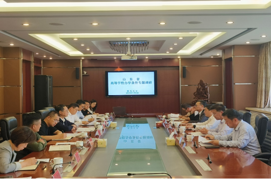 徐方全传达了山东省教育厅的工作要求。李军对调查组一行到校指导工作表示热烈欢迎。他简要介绍了学校发展基本情况。发展规划处处长马林刚从学校办学基本情况、办学指标测算、学校“十四五”发展规划执行情况、学校未来规划等方面进行了详细汇报。