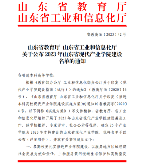新闻网讯 近日,山东省教育厅、山东省工业和信息化厅公布了2023年度山东省现代产业学院建设名单,学校申报的“集成电路产业学院”获批立项,这是鸭脖继海信人工智能学院、现代纺织产业学院之后,获批的第三个省级现代产业学院。
