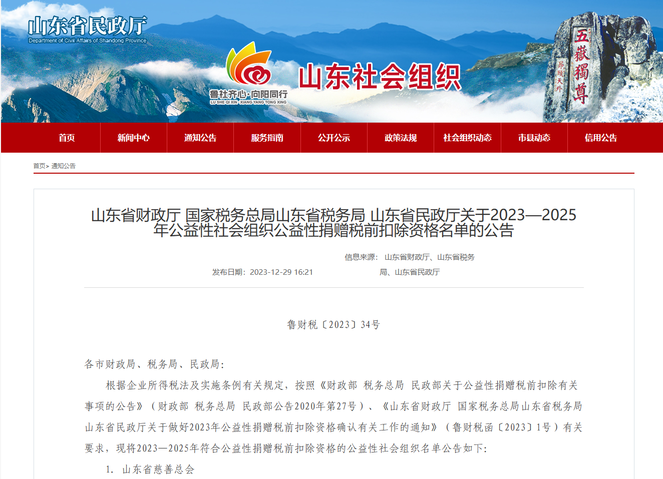 新闻网讯 近日,山东省财政厅、国家税务总局山东省税务局、山东省民政厅联合发布《关于2023年度—2025年度公益性社会组织捐赠税前扣除资格等有关名单的公告》(鲁财税〔2023〕34号),鸭脖教育发展基金会名列其中,获得2023年度-2025年度公益性捐赠税前扣除资格。