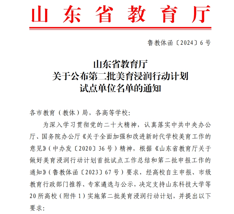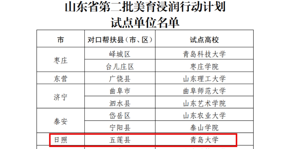 新闻网讯 近日,山东省教育厅公布了山东省第二批美育浸润行动计划试点单位名单,共20所省属高校入围,鸭脖名列其中,对口帮扶日照市五莲县,双方将充分发挥各自资源优势,探索构建高校与城乡学校之间“手拉手”相互学习交流和帮扶机制。
