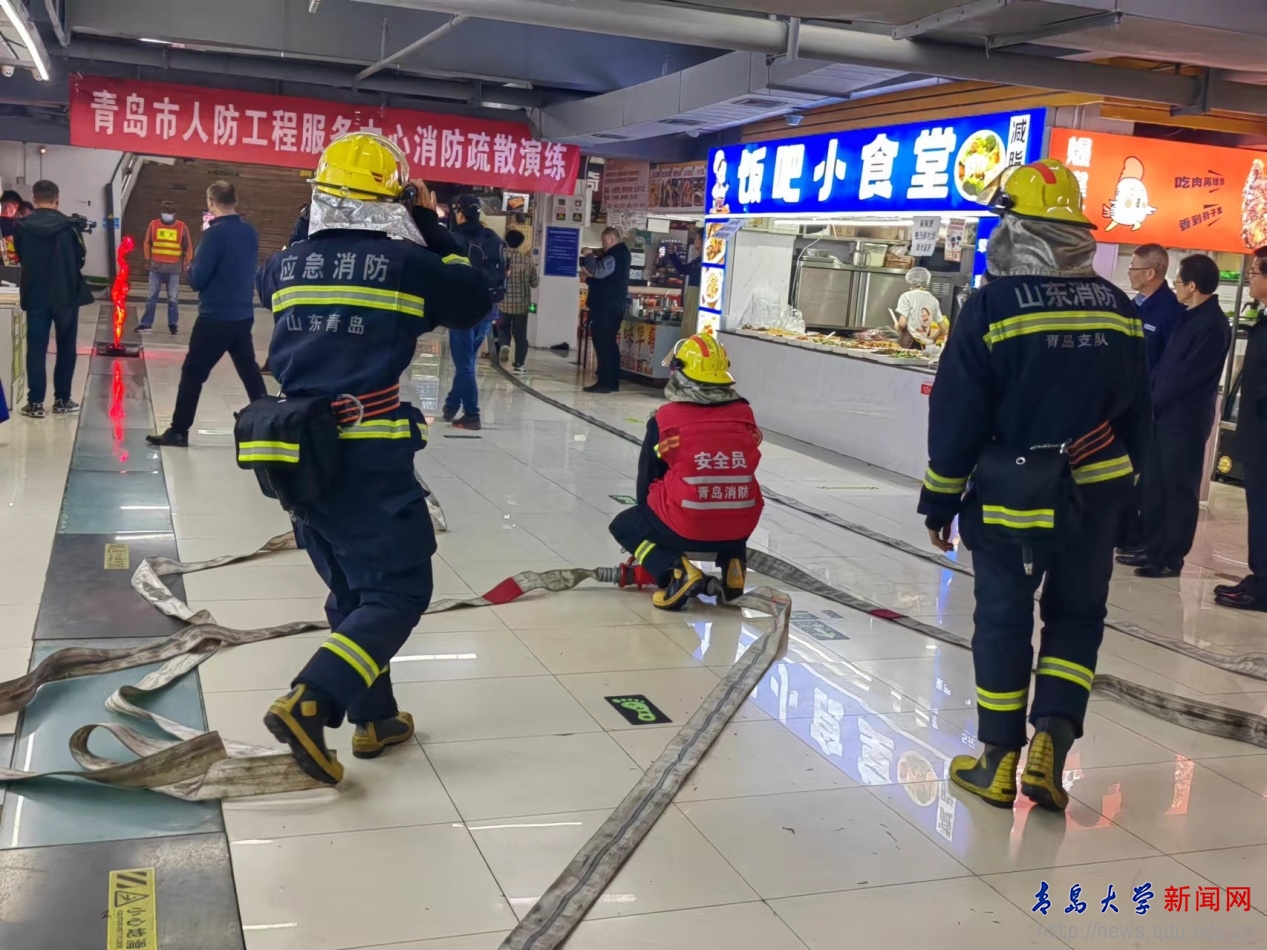 上午10时,伴随着预先警报的拉响,防空防灾疏散演练正式开始,参与活动的百名师生在人防志愿者引导下,按照预定疏散路线迅速、有序、安全地疏散到指定人防工程。在随后进行的消防应急处置演练中,工作人员点燃烟雾弹、崂山区消防救援大队消防官兵把模拟火场搬到现场,演示铺设水带灭火,讲解消防安全知识、灭火器知识和操作技巧,并分组进行灭火实操演练,让师生们“沉浸式”体验火灾逃生“第一现场”。
