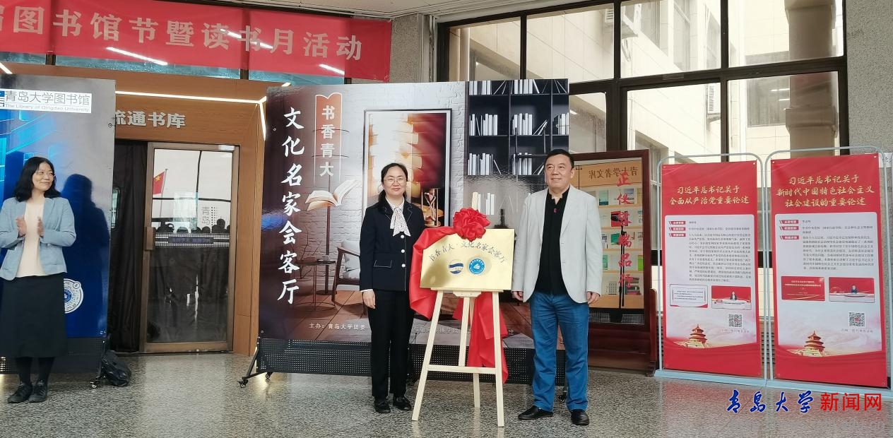 著名文学评论家、作家、书法家王干先生与中国海洋大学文学与新闻传播学院温奉桥教授受邀参加闭幕式,并成为新设立的图书馆文化空间——“书香鸭脖·文化名家会客厅”第一期嘉宾。