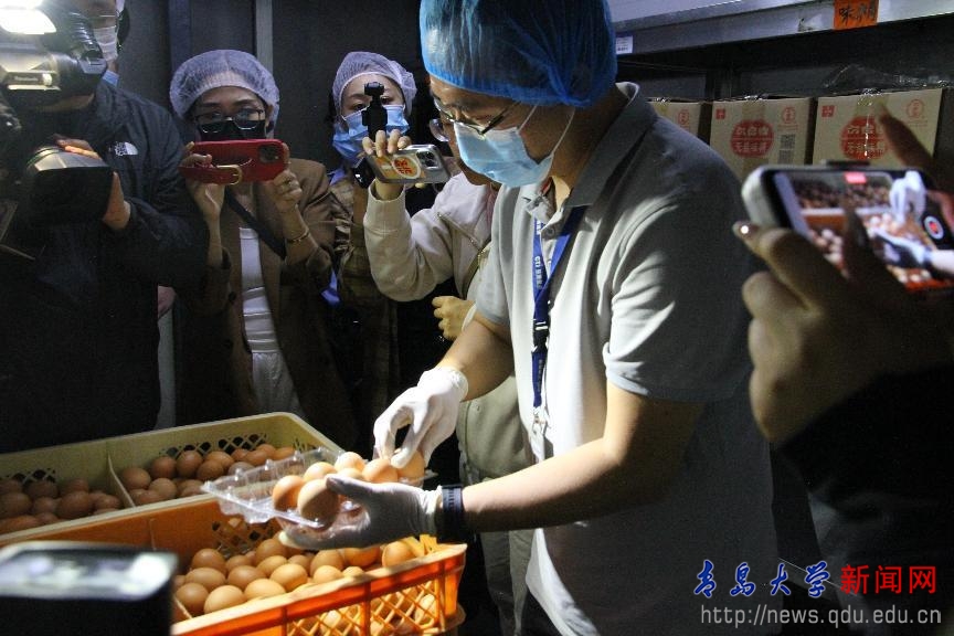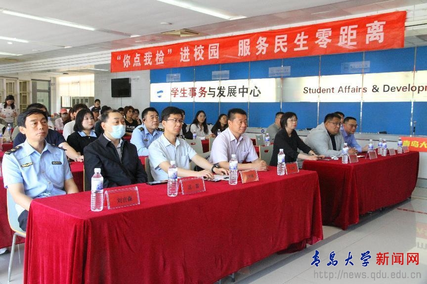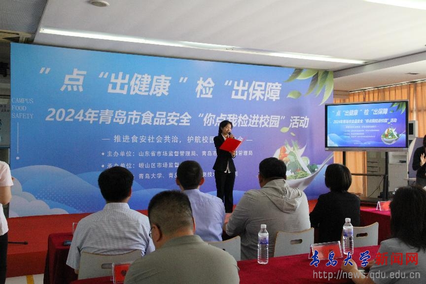 启动仪式上观看了青岛市“你点我检”工作宣传视频、发布十大重点点检品种、区域、并与同学用一问一答方式现场互动宣传食品安全相关知识。