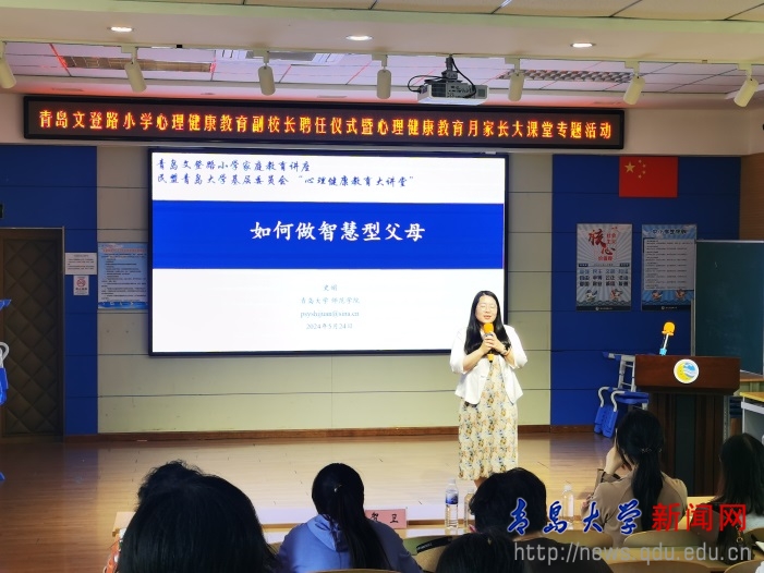 5月24日,史娟为青岛市文登路小学的家长们带来了一场富有启发性的专题讲座。讲座中,史娟结合生动的案例分析,向家长们阐述了智慧型父母在孩子成长过程中的重要作用。通过介绍在当前社会环境下父母如何保持积极心态,运用有效的沟通技巧与孩子建立亲密而健康的关系,以及如何在日常生活中培养孩子的良好品德和积极心态,鼓励家长们成为智慧父母,与孩子共同成长,营造一个和谐、温馨的家庭环境。讲座结束后,青岛文登路小学向史娟颁发了学校心理健康教育副校长聘书。