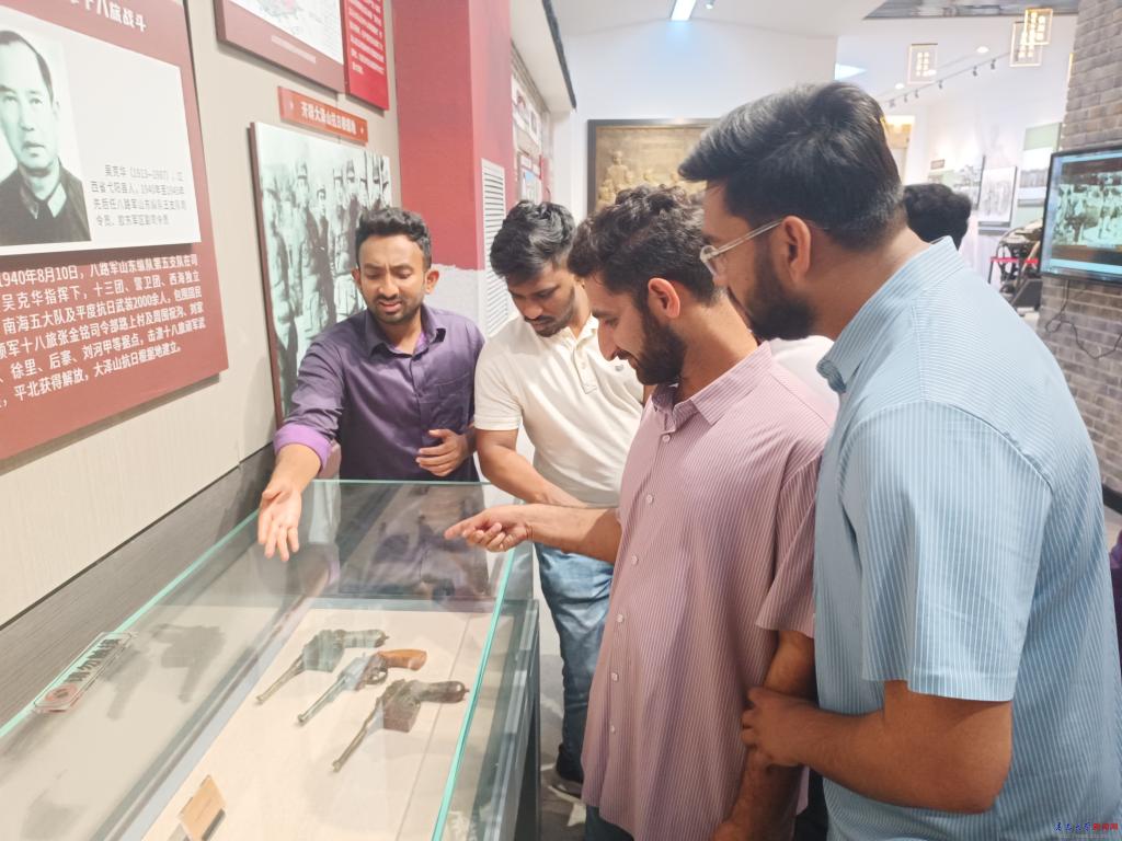 在平度市党史馆,在讲解员的讲解引领下留学生们依次参观了山河破碎、黎明之光、开天辟地、激流勇进、浴血荣光、铜墙铁壁、人间正道、换了人间、战天斗地、改革开放、砥砺前行11个部分,一个个生动的故事、一张张泛黄的珍贵图片、一件件具有历史痕迹的宝贵文物,将平度市党组织在革命、建设和改革各个历史时期所走过的光辉历程、发生的沧桑巨变和取得的伟大成就,全景展示了以杨明斋、刘谦初为代表的平度儿女英勇斗争、顽强奋斗的英勇事迹。