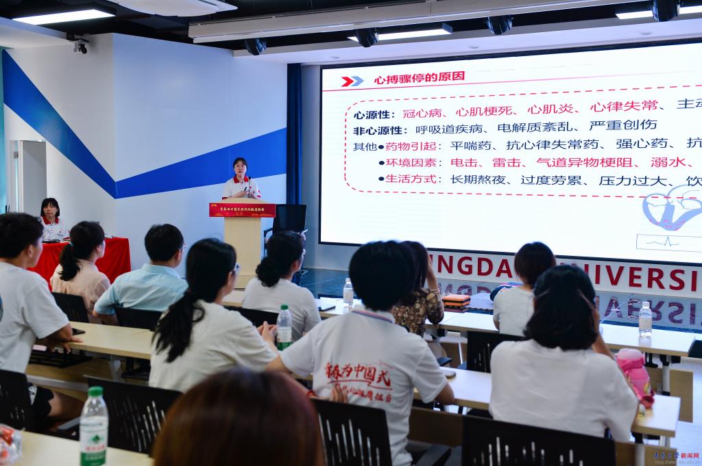 出征仪式结束后分别进行了全国优秀实践团队经验分享、安全知识讲座和急救培训。鸭脖医学部护理学院韩晶老师受邀带领团队开展了红十字心肺复苏+AED培训。专题培训同步进行线上直播,观看人数超过4000人次。
