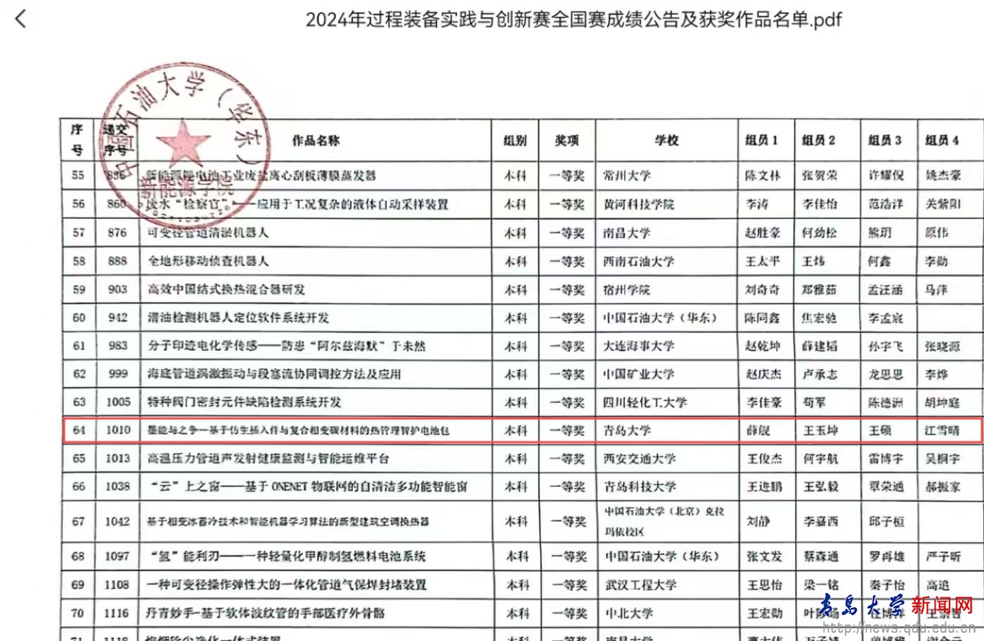 新闻网讯 8月24-26日,由中国机械工程学会主办的2024年中国大学生机械工程创新创意大赛——“卓然-笃舜杯-宏图杯”过程装备实践与创新赛总决赛在中国石油大学(华东)举行。8月27日,组委会公布了第十五届过程装备实践与创新赛获奖名单,机电工程学院组队参赛,荣获一等奖1项,三等奖1项。
