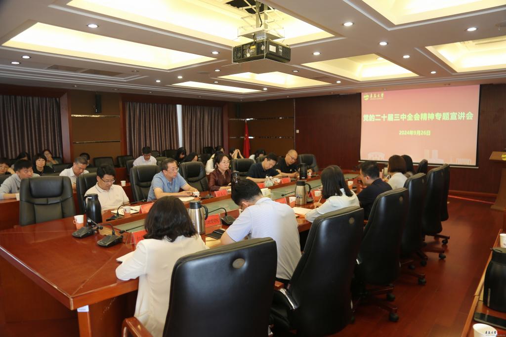 新闻网讯 9月26日,校党委常委、副校长何燕在办公楼407会议室为分管职能部门和联系学院宣讲党的二十届三中全会精神。
