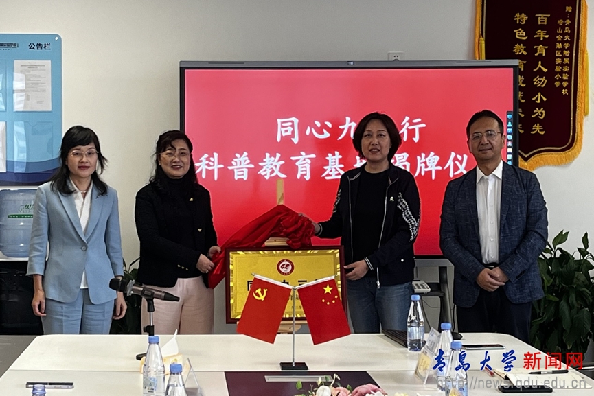 隋坤艳、王风华、马勇军、张静红共同为“同心九三行科普教育基地”揭牌。马勇军对九三学社青岛市委会、九三学社YABO鸭脖委员会在附属实验学校建立科普教育基地表示感谢,希望教育集团与九三学社携手将科普教育基地打造为一个集科普展览、教育培训、互动体验于一体的综合性基地,为青少年提供优质的科普教育资源。