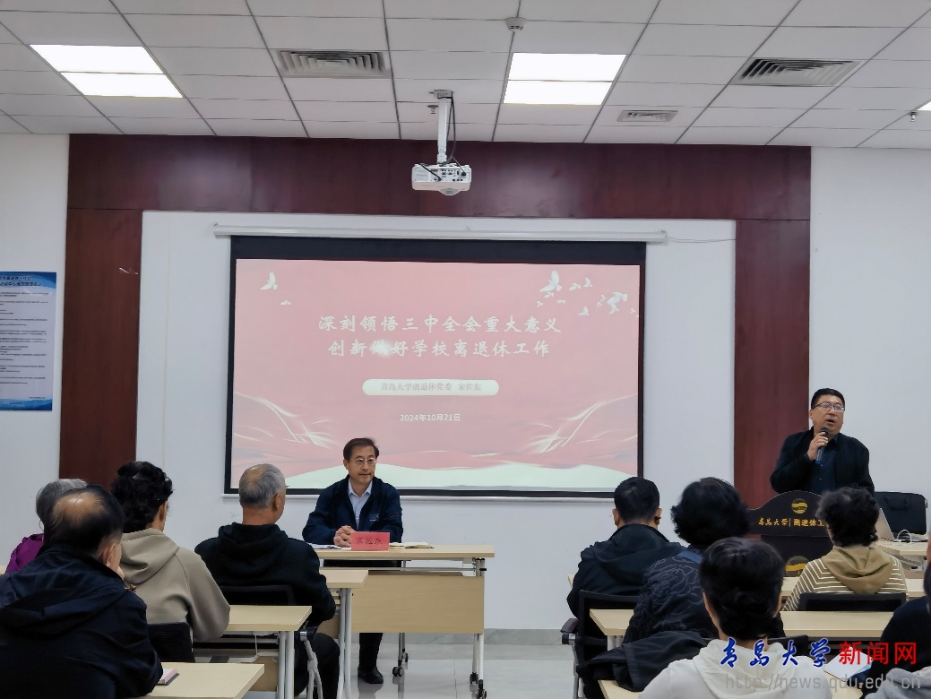宋佐东以《深刻领悟三中全会重大意义创新做好学校离退休工作》为题,从党的二十届三中全会概况、深入学习领会习近平总书记在党的二十届三中全会上的重要讲话精神、全面准确理解《决定》提出的重大举措等三个方面,带领大家全面学习了党的二十届三中全会精神,并重点学习了与离退休人员相关的健全保障和改善民生制度体系的内容。宋佐东强调,党的二十届三中全会是在以中国式现代化全面推进强国建设、民族复兴伟业的关键时期召开的一次十分重要的会议。全会作出的重大战略部署、取得的重要成果,事关党和国家事业前进方向,事关改革开放和现代化建设全局。离退休各党组织和全体党员要继续深入学习贯彻党的二十届三中全会精神,原原本本、逐字逐句学习《决定》,学习习近平总书记在全会上的重要讲话精神,跟进学习习近平总书记关于全面深化改革的重要论述,切实领会精神实质和精髓要义,立足本职抓好贯彻落实。