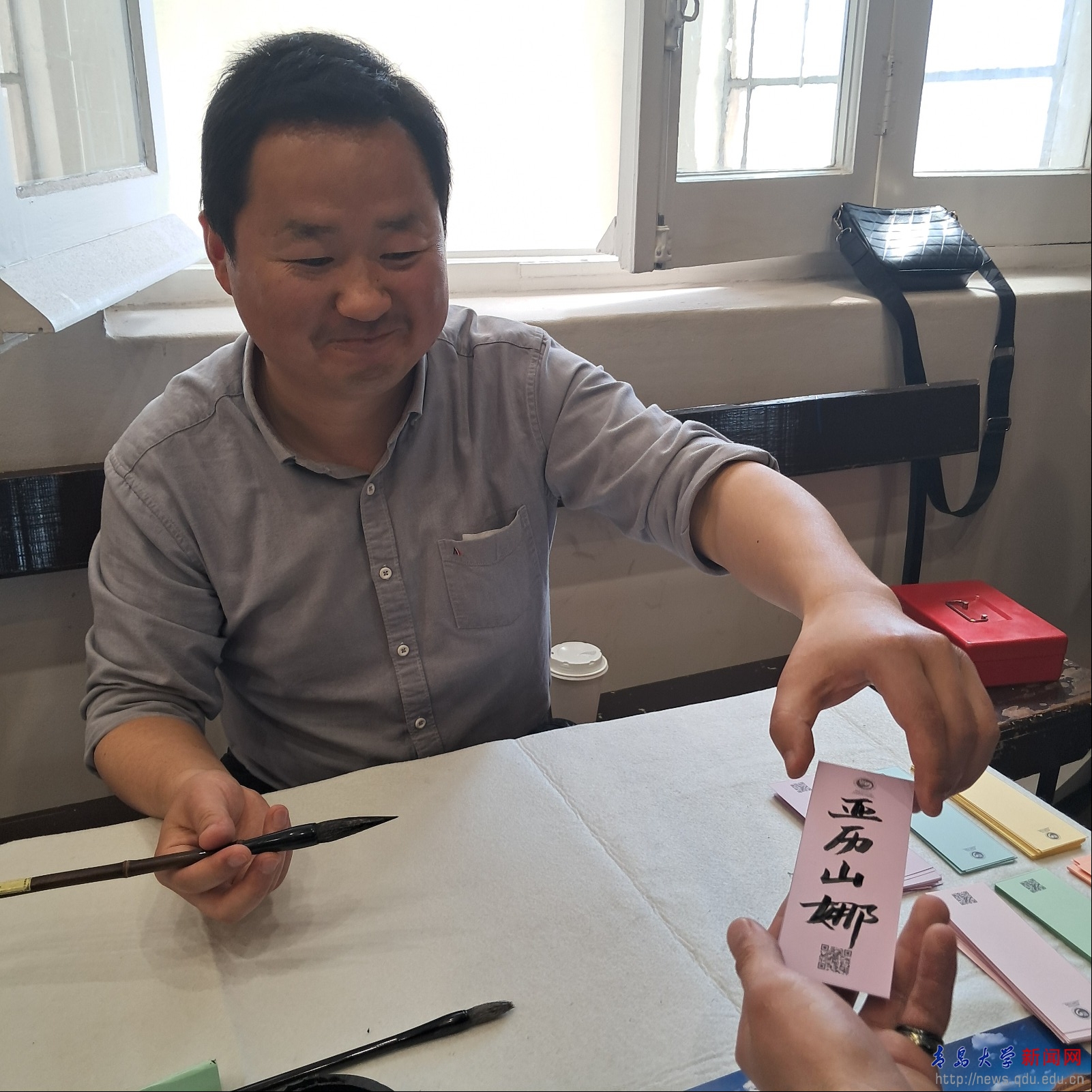 在活动现场,由郭梅院长指导,乌拉圭共和国大学孔子学院设立了中国传统文化展位,展示了春卷等经典中国美食,吸引大量参与者品尝。与此同时,孔子学院还准备了精美的书签作为纪念品,并由王烈陈老师现场用毛笔为观众书写姓名,让大家近距离感受到中国书法的艺术魅力。整个展位气氛热烈,参与者对书签代表的中国文化兴趣浓厚,纷纷表示这种文化体验十分有趣。