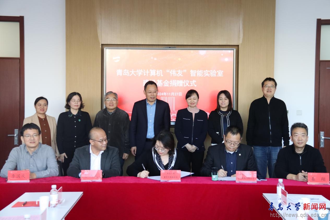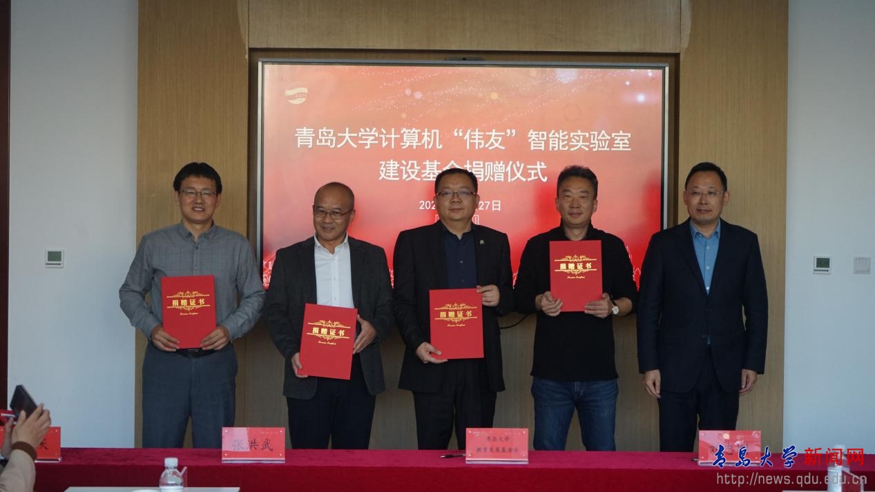 计算机“伟友”智能实验室建设基金由罡金集团董事长、92级计算机专业刘志刚校友发起。青岛罡金国际合作服务有限公司在上半年向计算机科学技术学院捐赠14万元、外语学院捐赠6万元用于奖励优秀学子的基础上,今天继续捐赠45万元成立计算机“伟友”智能实验室建设基金。同时,92级计算机专业刘志刚、张洪武、基翔、李国庆、杨燚5位校友以个人名义向计算机“伟友”智能实验室建设基金捐赠人民币5万元。