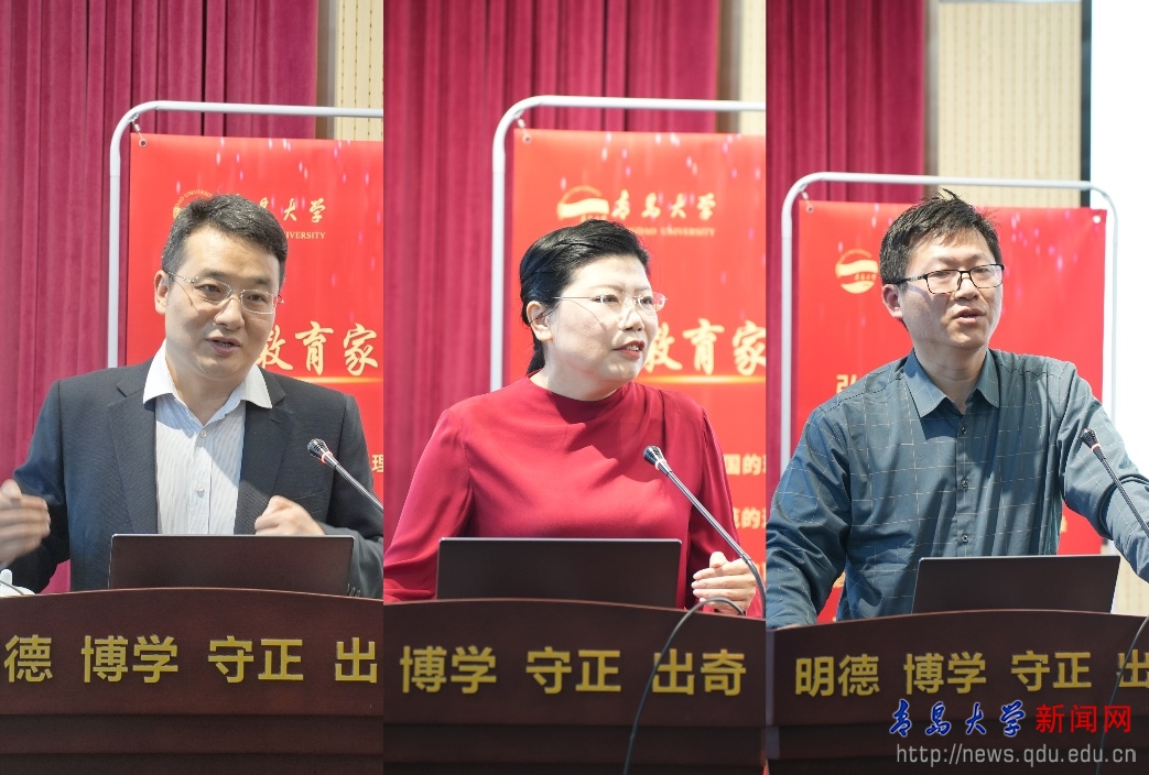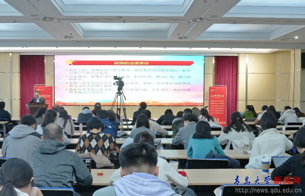 山东省师德宣讲库专家、法学院许庆永副教授做了高校教师法治教育专题报告,帮助教师明确法律责任,提升法治素养。两位优秀教师代表进行了教学与科研工作经验分享。国家级课程思政教学名师、文学与新闻传播学院马光亭教授,结合自身躬耕教坛25年的工作经历,分享了坚持以“立德树人”为主线,在从打好教学基础、到创新成长、最终到特色发展的教师成长“三个阶段”中的经验和感悟。国家级人才、物理科学学院院长李强教授,结合自身入职鸭脖10年的成长与发展历程,分享了青年教师在科研方向确定、项目申报、研究生指导等方面的经验和体会。