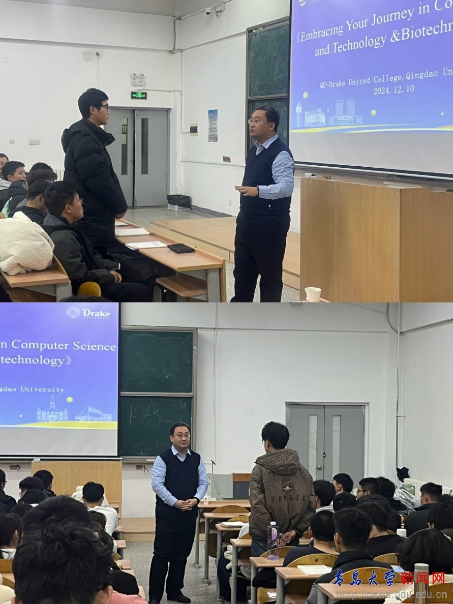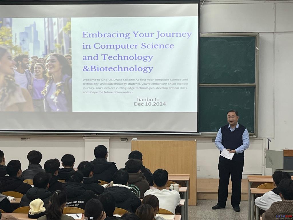 新闻网讯 为加强学校文化和专业思想教育,帮助同学们适应大学生活,进一步巩固专业思想,12月10日晚,德雷克联合学院在金家岭校区西院1教召开专题报告会,邀请校党委常委、副校长李建波教授为2024级全体学生作 Embracing Your Journey in Computer Science and Technology &Biotechnology 专题报告。校领导、德雷克联合学院党委书记、院长李军主持报告会。