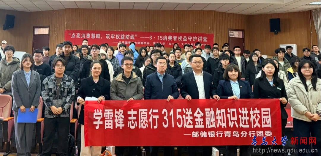 此次活动通过理论讲解与案例分析,助力学生识别消费陷阱、强化维权意识,同时倡导理性消费观,为营造健康校园消费文化注入动力。校团委工作人员、中国邮政储蓄银行青岛分行相关领导、法学院教师以及各学院学生共计150余人参与活动。