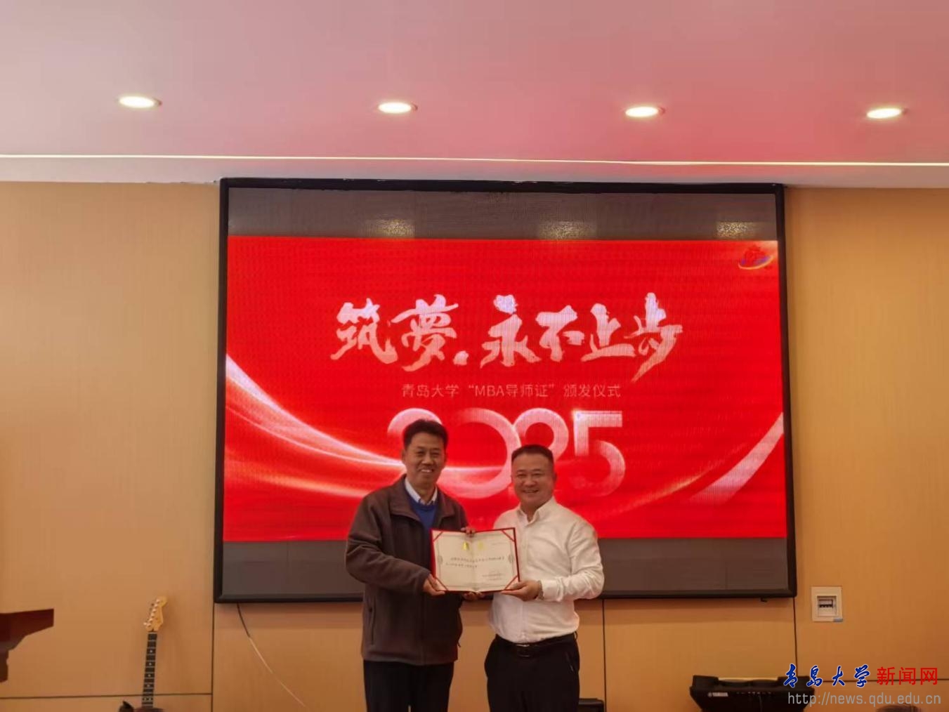 商学院院长钟永光为刘凤昆颁发YABO鸭脖MBA校外导师证书。